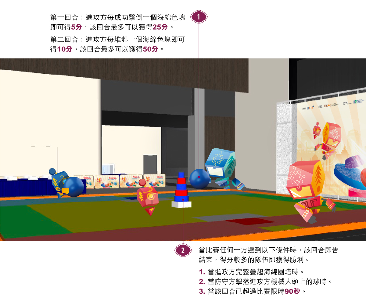 比賽分為紅、藍兩組,每組會派出兩部機械人對壘。每場比賽有兩個回合,兩組機械人將分別擔當進攻及防守的角色。在第一回合,進攻方須於限時內擲球擊倒置於場中心由五層色塊(Lagori Discs)組成的海綿圓塔(Lagori Tower)。進攻方每成功擊倒一個海綿色塊即可得5 分,該回合最多可以獲得25分。第二回合,即將所有海綿色塊擊倒後或停止進攻時間(Break Shot Time)結束後,進攻方可在剩餘的遊戲時間內把所有海綿色塊依次重新疊起,每堆起一個海綿色塊即可得10分,該回合最多可以獲得50分。防守方於敵隊(進攻方)堆疊海綿色塊的同時,可以擲球擊落放在進攻方機械人頭上的球。當比賽任何一方達到以下條件時,該回合即告結束,得分較多的隊伍即獲得勝利。